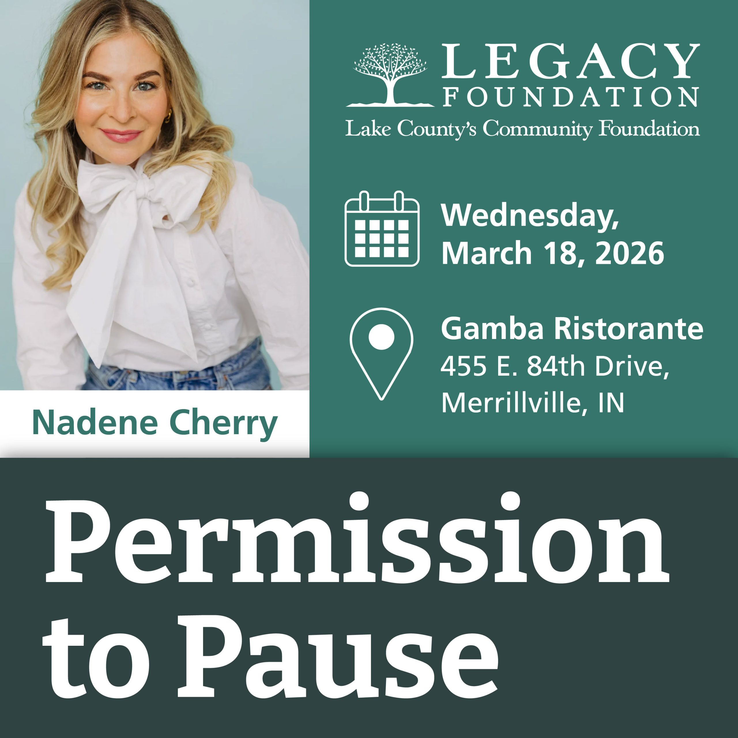 Upcoming Events Permission to Pause Wednesday, March 18 11:30 AM - 1:00 PM Gamba Ristorante REGISTER FUTURE READY Friday, April 10 9:30 AM - 2:00 PM Lake County Public Library | Merrillville Branch REGISTER Foundation Partners and Sponsors